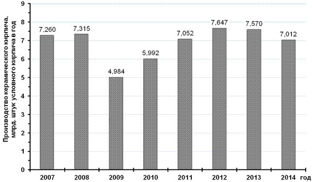 По данным Ассоциации производителей керамических материалов [5],общий объем выпуска керамического кирпича в России на 2014 год составил 7,012 млрд шт.условного кирпича. Динамика производства керамического кирпича на период 2007–2014 годовпоказана на рисунке 1.1.
